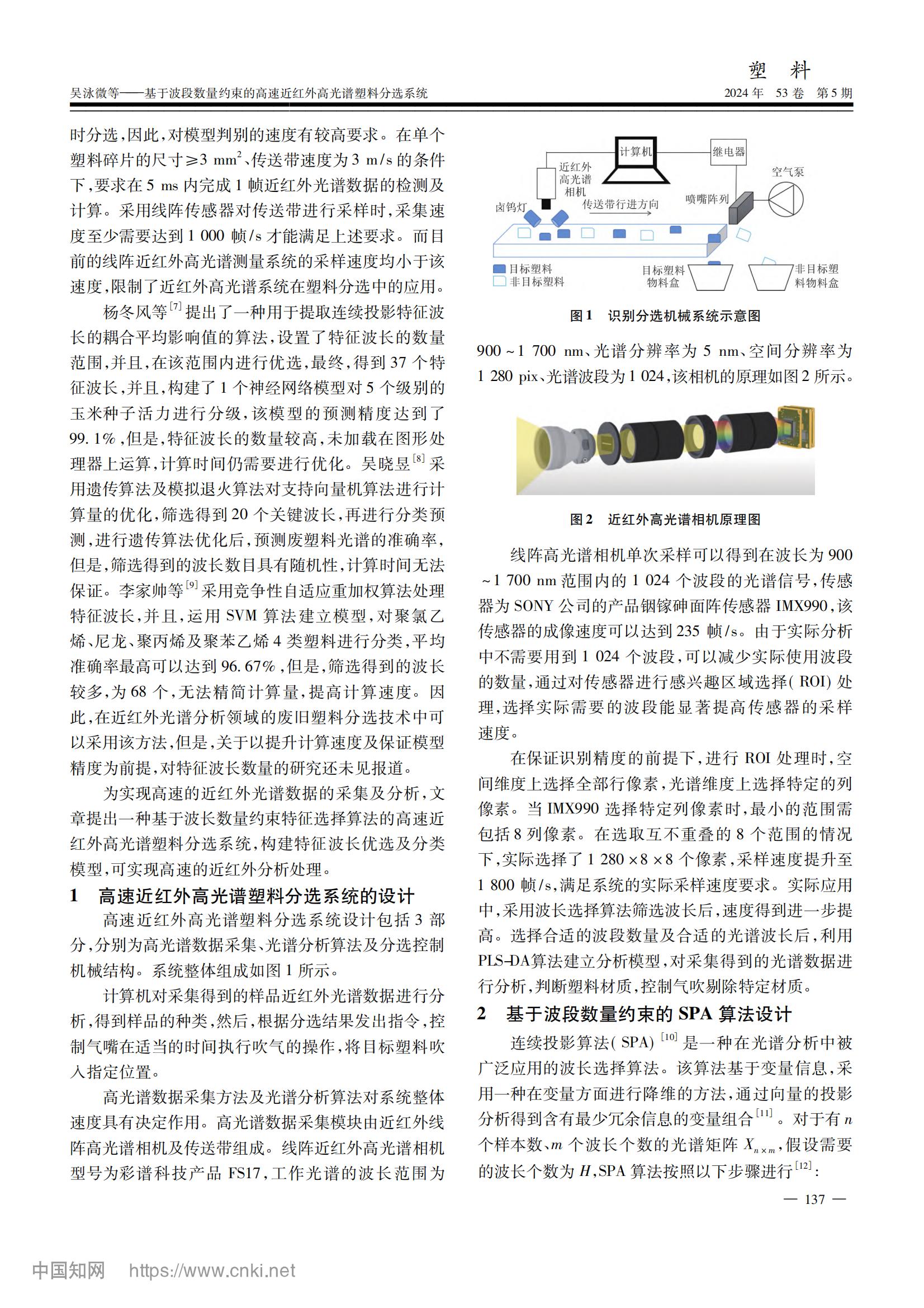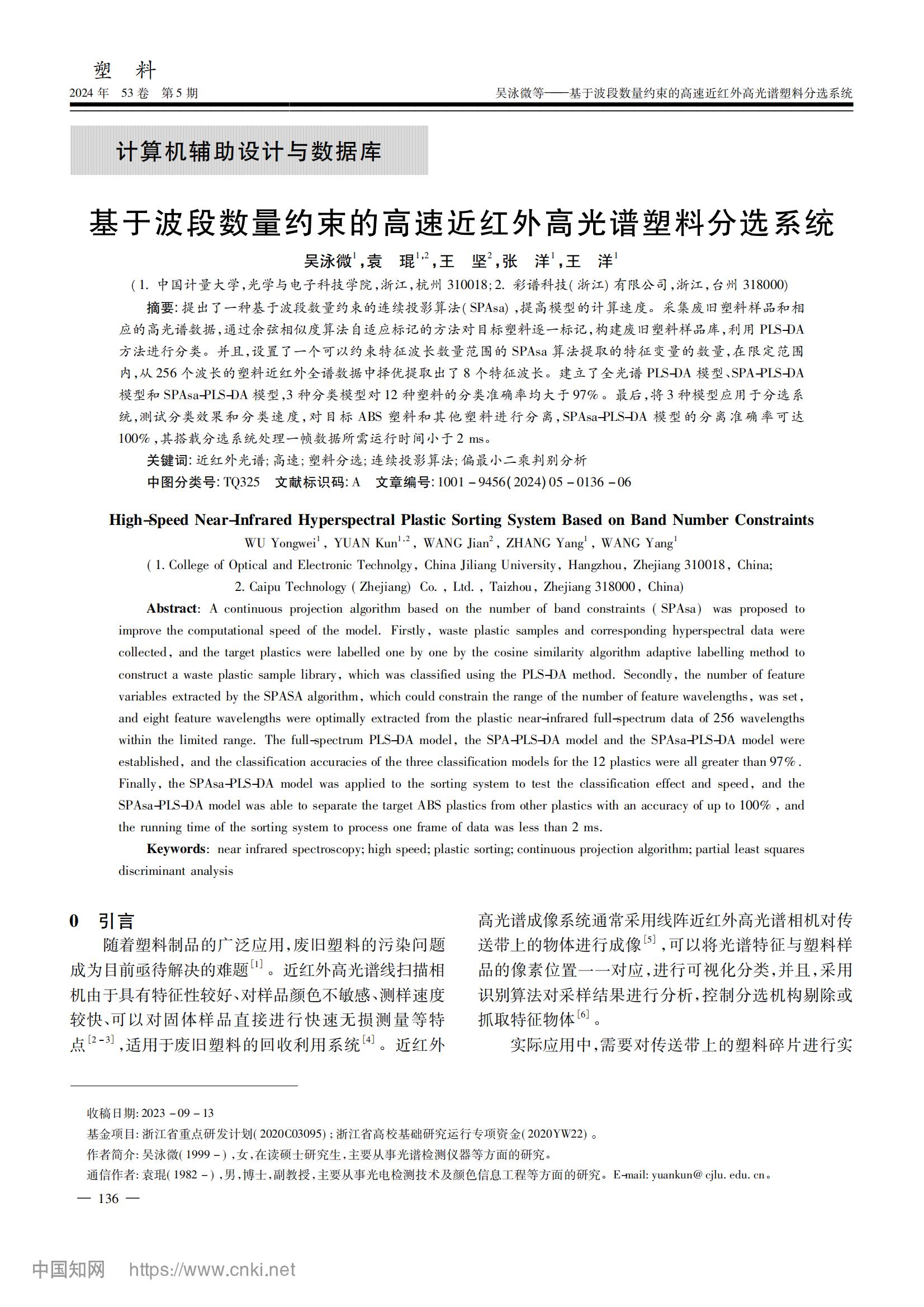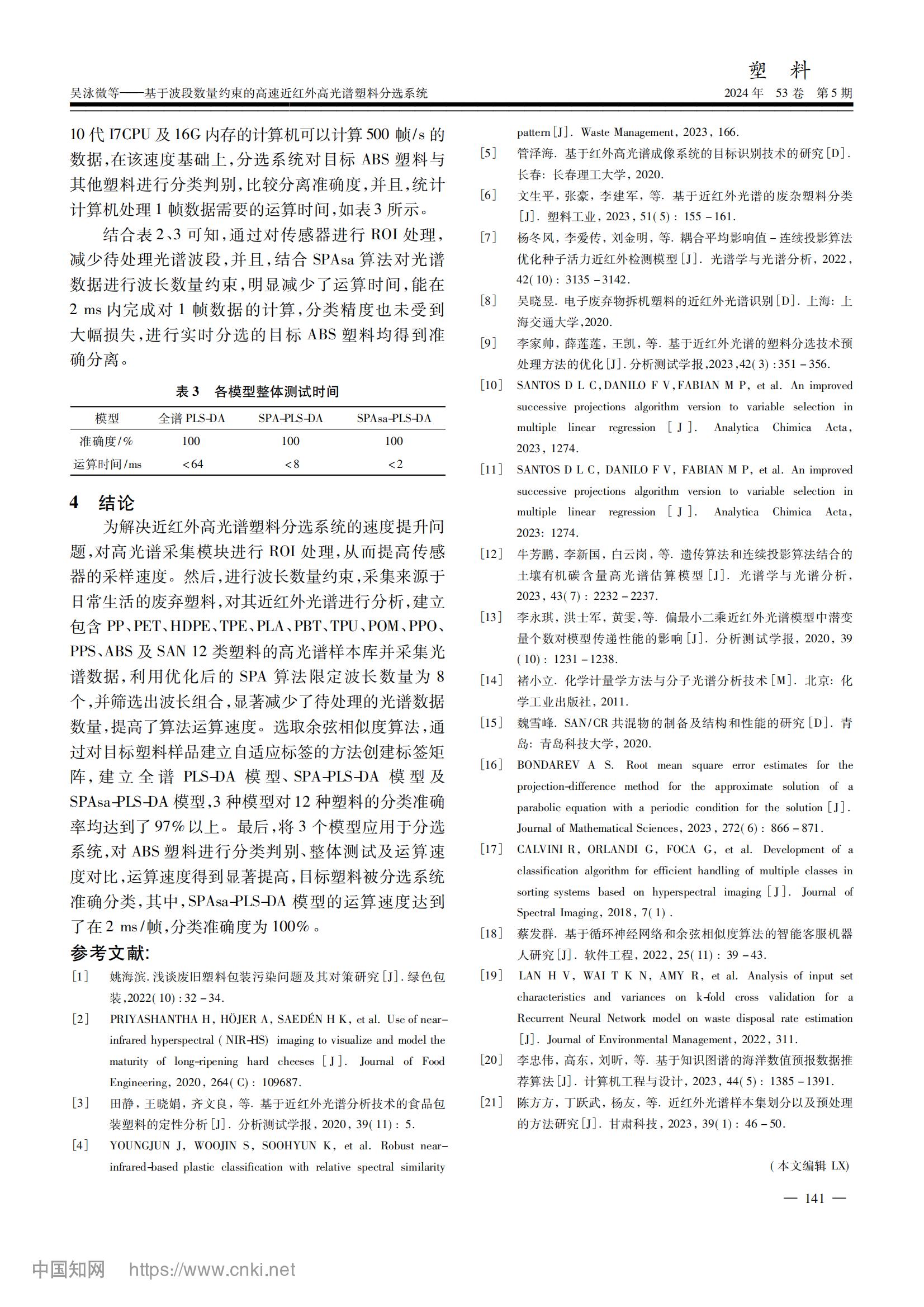 本論文提出了一種基于波段數(shù)量約束的連續(xù)投影算法(SPAsa),提高模型的計(jì)算速度。采集廢舊塑料樣品和相應(yīng)的高光譜數(shù)據(jù),通過(guò)余弦相似度算法自適應(yīng)標(biāo)記的方法對(duì)目標(biāo)塑料逐一標(biāo)記,構(gòu)建廢舊塑料樣品庫(kù),利用PLS-DA方法進(jìn)行分類。并且,設(shè)置了一個(gè)可以約束特征波長(zhǎng)數(shù)量范圍的SPAsa算法提取的特征變量的數(shù)量,在限定范圍內(nèi),從256個(gè)波長(zhǎng)的塑料近紅外全譜數(shù)據(jù)中擇優(yōu)提取出了8個(gè)特征波長(zhǎng)。建立了全光譜PLS-DA模型、SPA-PLS-DA模型和SPAsa-PLS-DA模型,3種分類模型對(duì)12種塑料的分類準(zhǔn)確率均大于97%。最后,將3種模型應(yīng)用于分選系統(tǒng),測(cè)試分類效果和分類速度,對(duì)目標(biāo) ABS 塑料和其他塑料進(jìn)行分離,SPAsa-PLS-DA 模型的分離準(zhǔn)確率可達(dá)100%,其搭載分選系統(tǒng)處理一幀數(shù)據(jù)所需運(yùn)行時(shí)間小于2ms。