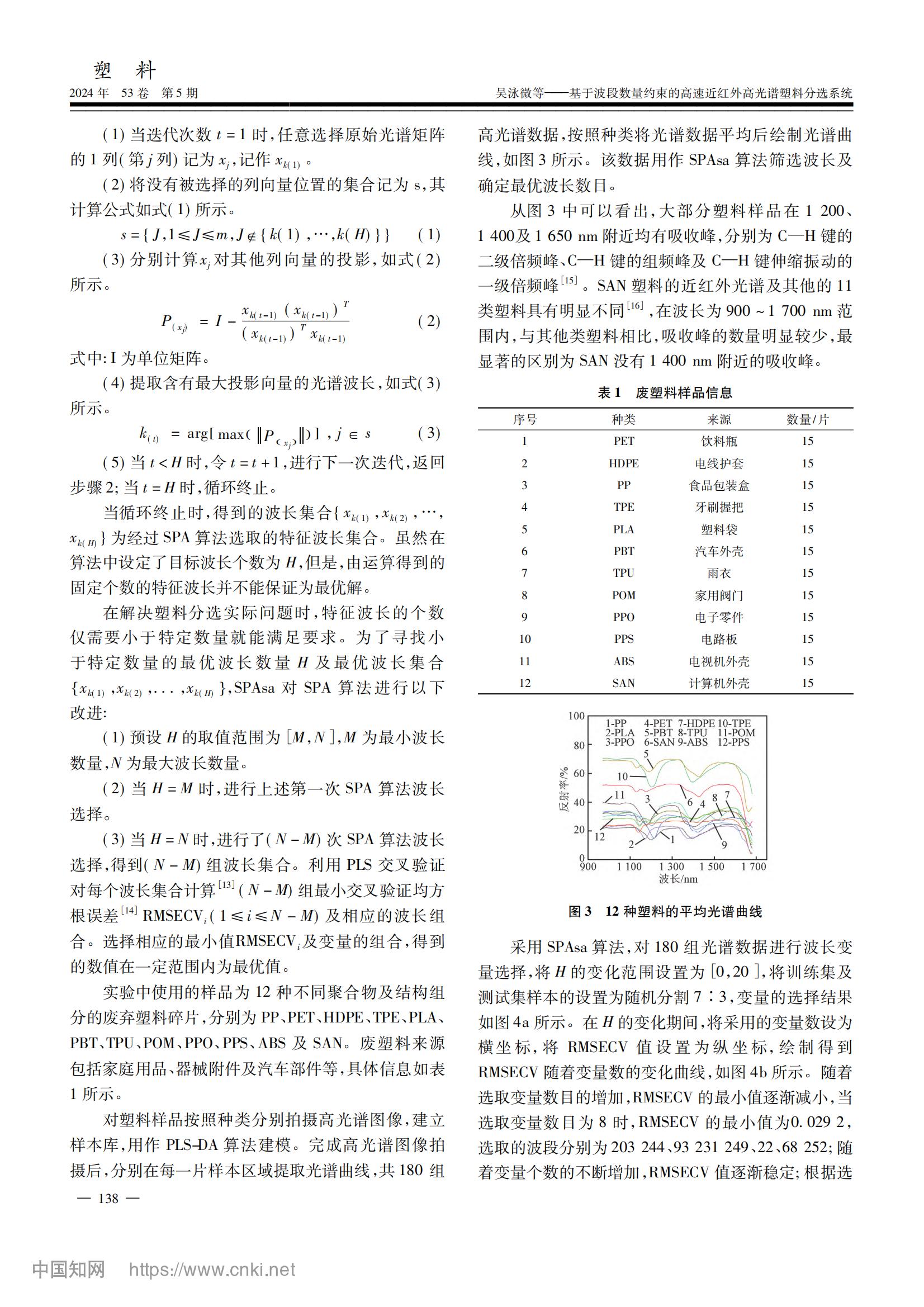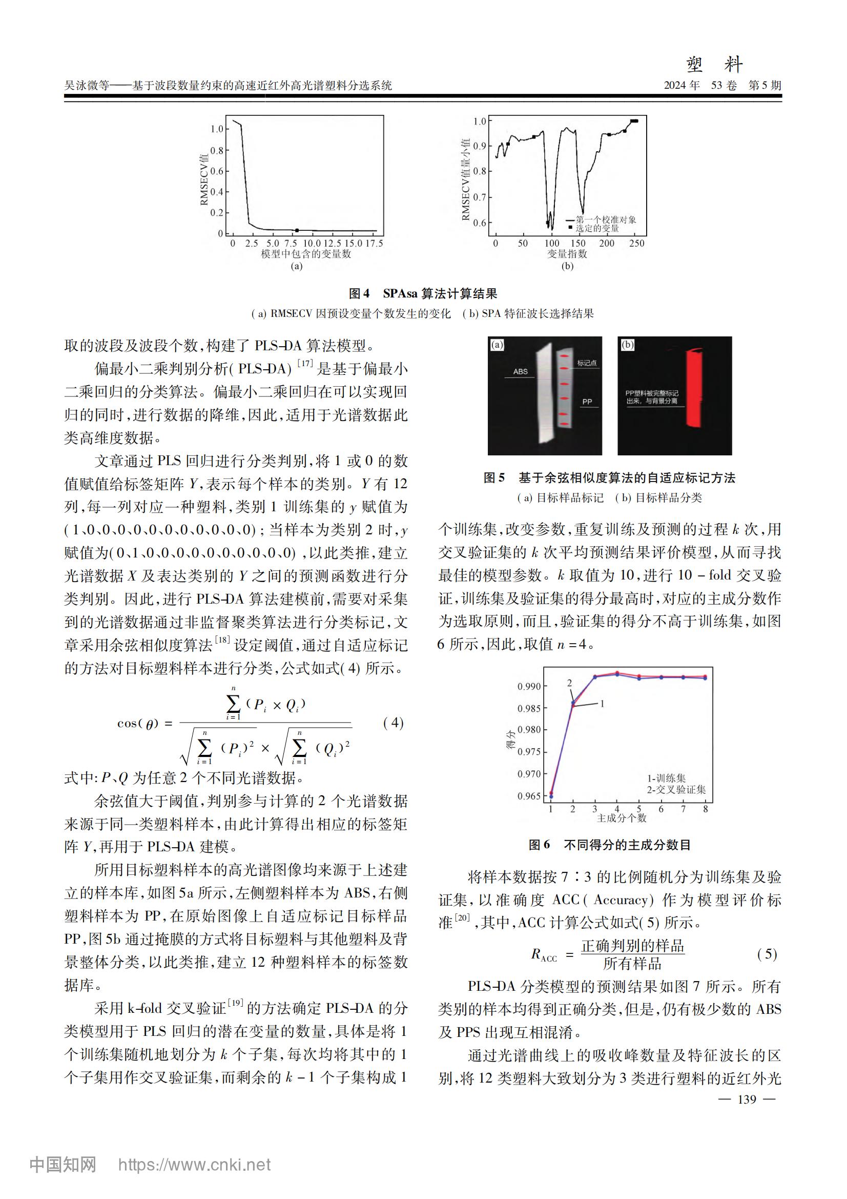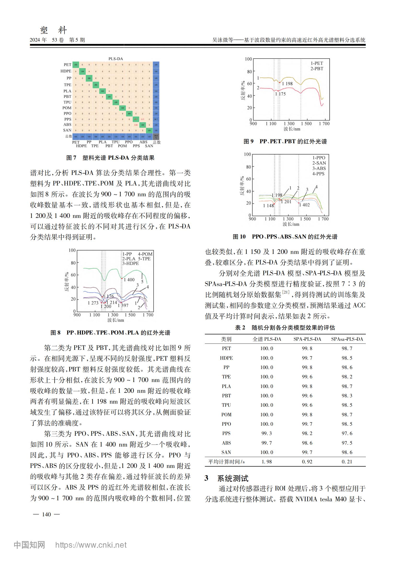 本論文提出了一種基于波段數(shù)量約束的連續(xù)投影算法(SPAsa),提高模型的計(jì)算速度。采集廢舊塑料樣品和相應(yīng)的高光譜數(shù)據(jù),通過(guò)余弦相似度算法自適應(yīng)標(biāo)記的方法對(duì)目標(biāo)塑料逐一標(biāo)記,構(gòu)建廢舊塑料樣品庫(kù),利用PLS-DA方法進(jìn)行分類。并且,設(shè)置了一個(gè)可以約束特征波長(zhǎng)數(shù)量范圍的SPAsa算法提取的特征變量的數(shù)量,在限定范圍內(nèi),從256個(gè)波長(zhǎng)的塑料近紅外全譜數(shù)據(jù)中擇優(yōu)提取出了8個(gè)特征波長(zhǎng)。建立了全光譜PLS-DA模型、SPA-PLS-DA模型和SPAsa-PLS-DA模型,3種分類模型對(duì)12種塑料的分類準(zhǔn)確率均大于97%。最后,將3種模型應(yīng)用于分選系統(tǒng),測(cè)試分類效果和分類速度,對(duì)目標(biāo) ABS 塑料和其他塑料進(jìn)行分離,SPAsa-PLS-DA 模型的分離準(zhǔn)確率可達(dá)100%,其搭載分選系統(tǒng)處理一幀數(shù)據(jù)所需運(yùn)行時(shí)間小于2ms。